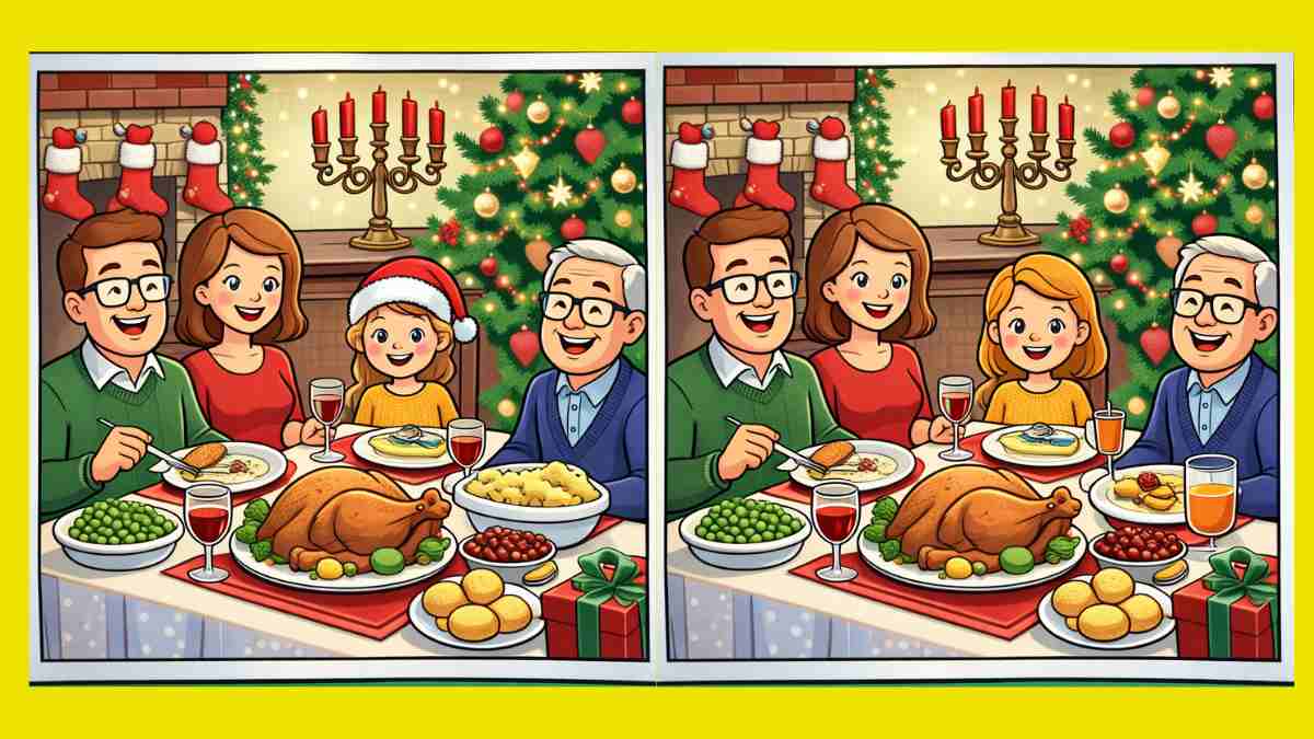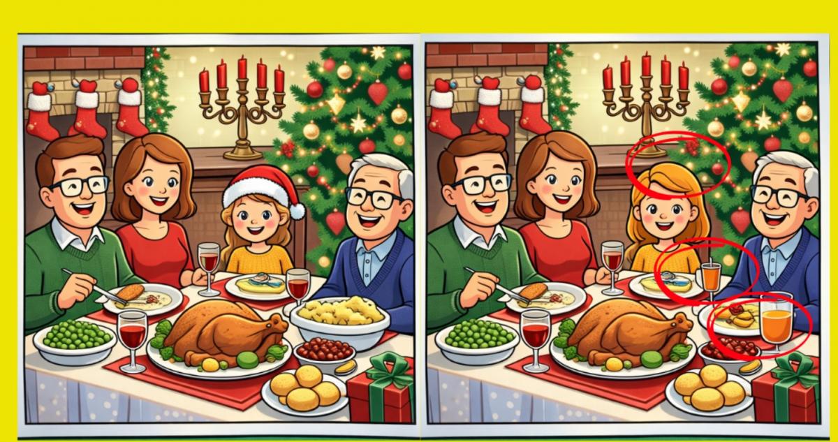 Er du klar for neste utfordring? Ta en nærmere titt på to bilder av en julemiddag med familien. De ser kanskje like ut ved første øyekast, men det er tre små forskjeller som skjuler seg i dem. Tror du at du kan finne dem alle på 16 sekunder? Prøv det og test synsskarpheten din!