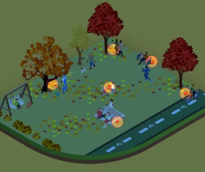 Bildet viser en høstlig lekeplass der folk og barn går rundt. Alle er opptatt med sitt, men ved siden av noen av dem ligger gresskarene vi leter etter.