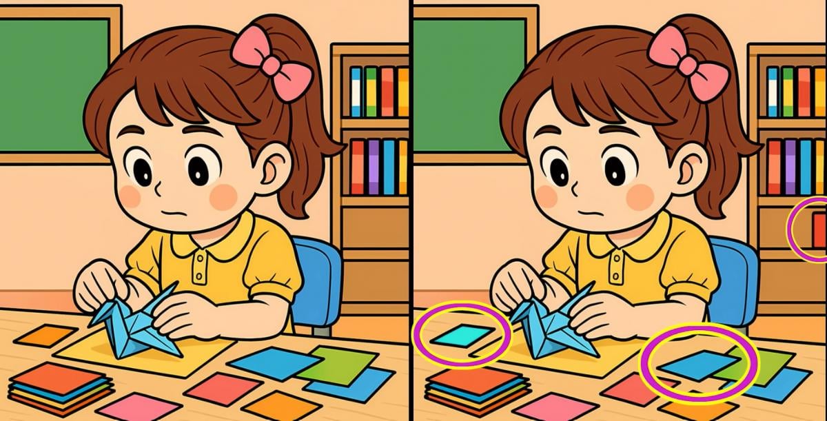 Er du klar for neste utfordring? Ta en nærmere titt på to bilder av en jente som lager papirfugler. De ser kanskje like ut ved første øyekast, men det er tre små forskjeller. Tror du at du kan finne dem alle på 19 sekunder? Prøv det og test synsskarpheten din!